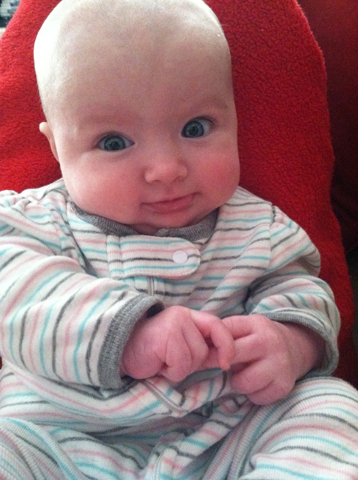 Elyse still rolls tummy to back and is so close to rolling back to tummy. Her bumbo is her favorite thing right now because it allows her to be up and seeing what’s going on. She’s holding toys and grabbing for things constantly. She also ALWAYS has her hands in her mouth. She laughs when you pull her hands away from her mouth to get her dressed, probably the only baby I have ever known to laugh while getting clothes on. She even laughs during some diaper changes. She truly is such a sweetheart.