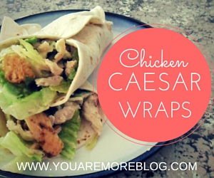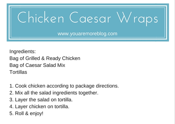 Wednesdays tend to be our busiest days for dinner. Since my husband and I are in ministry we have to be at church really early. I usually start trying to get out of the door right after the kids wake up from their nap at four. So instead of picking up food I decided to try whipping together what we needed to make Chicken Caesar Wraps and bringing it along. It seemed easy to pack, and even easier to put together and would be much better then fast food.